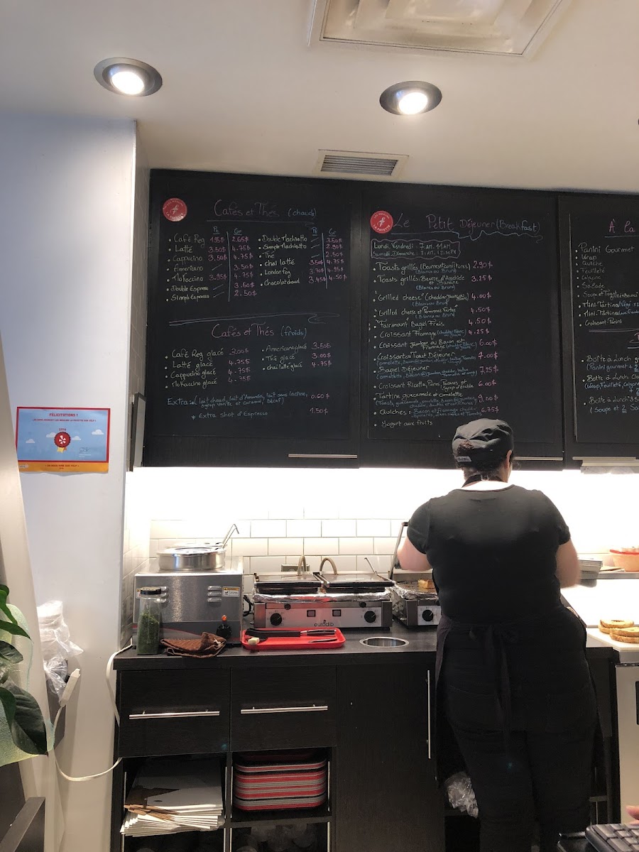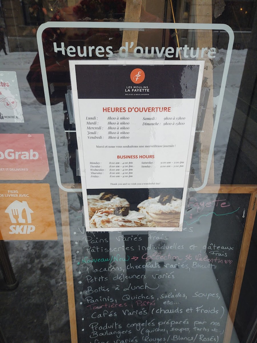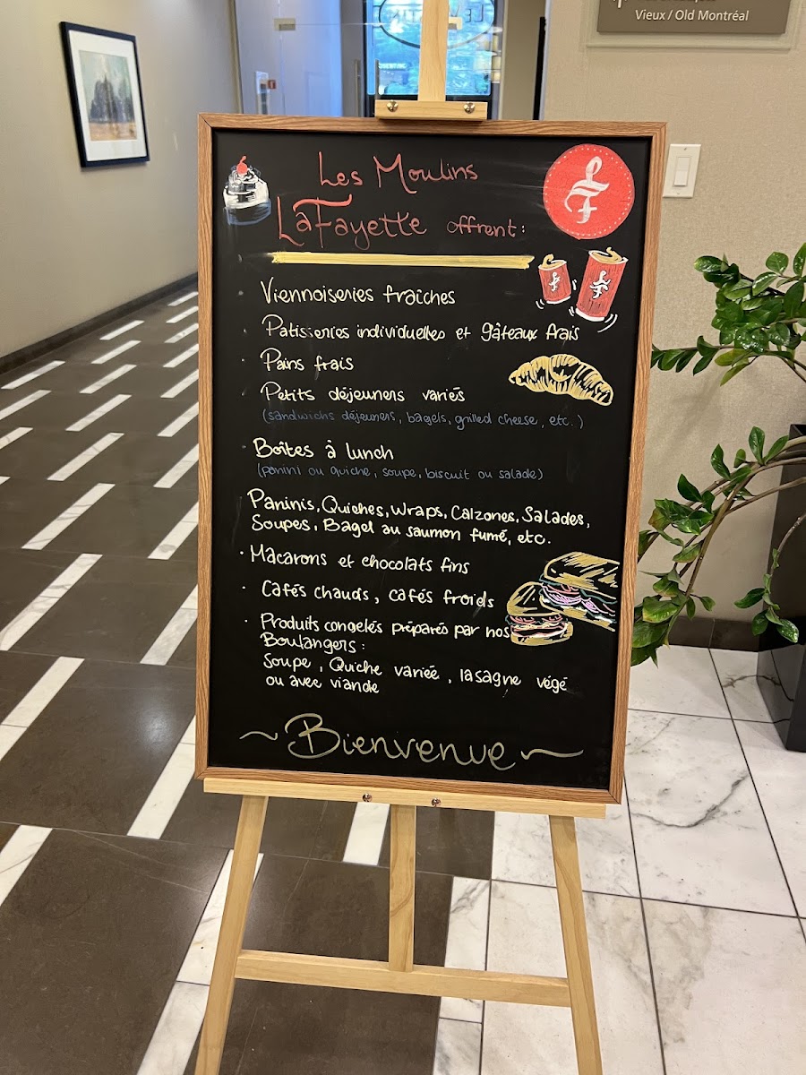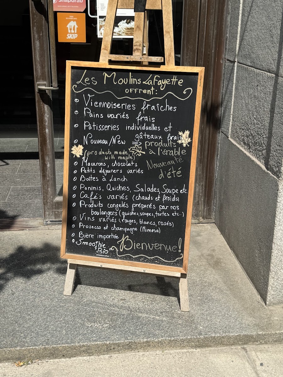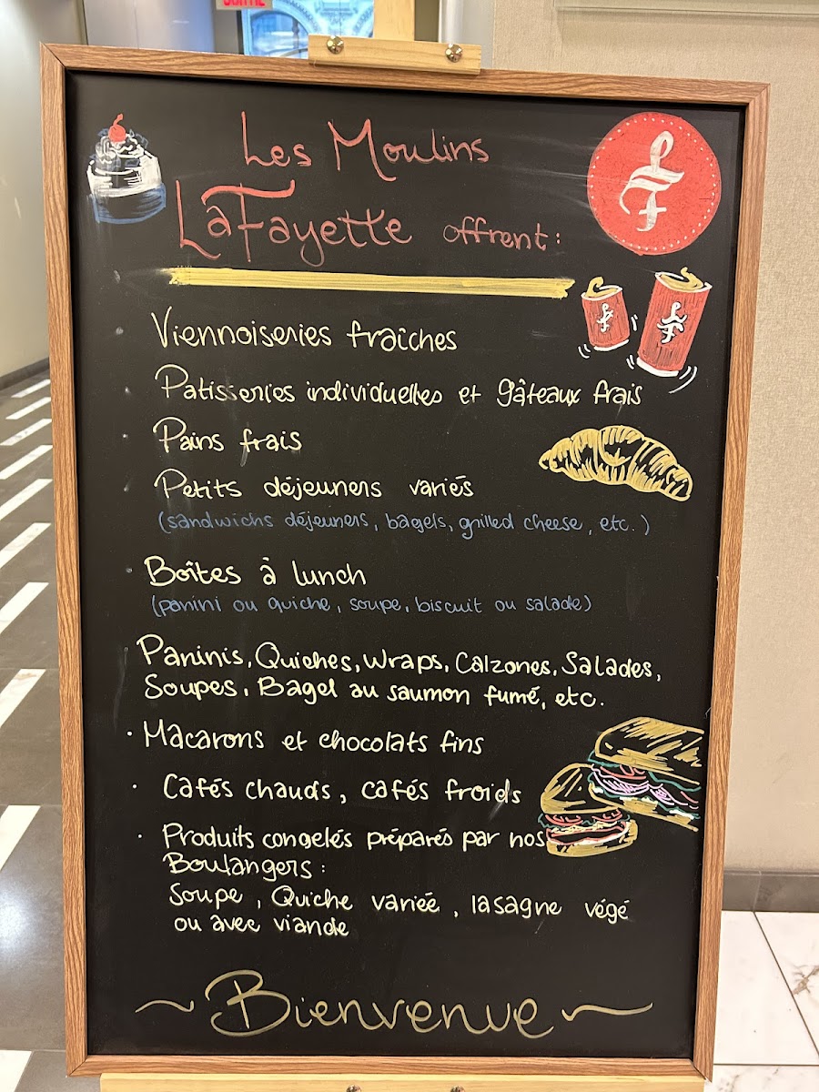 The menu at Les Moulins La Fayette offers a variety of bakery and pastry items alongside light meals and beverages. It features traditional viennoiseries, including almond croissants and chocolate croissants, which are typical breakfast options. For savory choices, the menu includes sandwiches such as smoked meat and breakfast sandwiches, as well as quiches like the Quiche Lorraine. Dessert selections highlight items like mousse au chocolat, chocolate eclairs, and the dôme chocolat caramel.